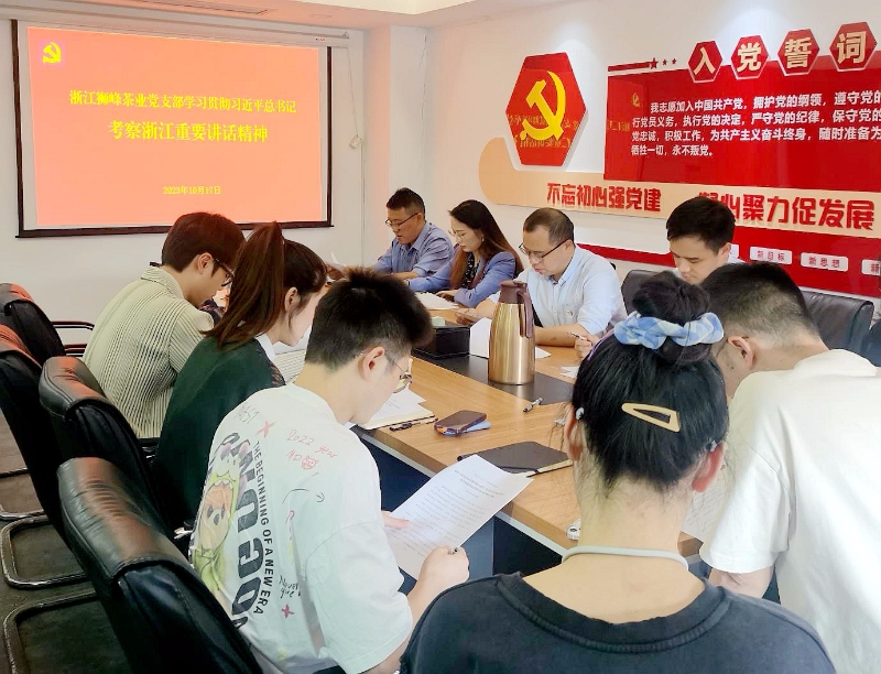 根据浙茶集团党委部署安排,10月17日,浙茶集团狮峰茶业党支部认真开展专题学习会,深入学习习近平总书记考察浙江重要讲话精神。支部书记陆耿林主持会议并讲话,支部党员、入党积极分子参会。